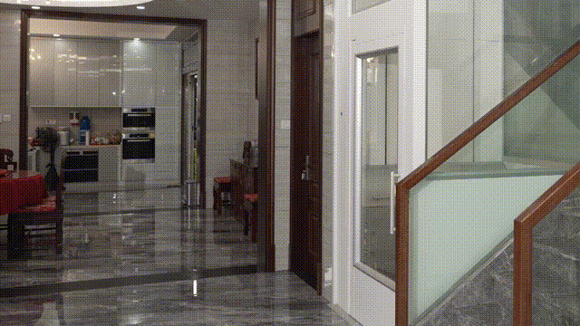 一樓玻璃井道的設(shè)計不僅增加了視覺上的通透感,而且可以讓電梯外的家人時刻關(guān)注到李先生在電梯里的情況。