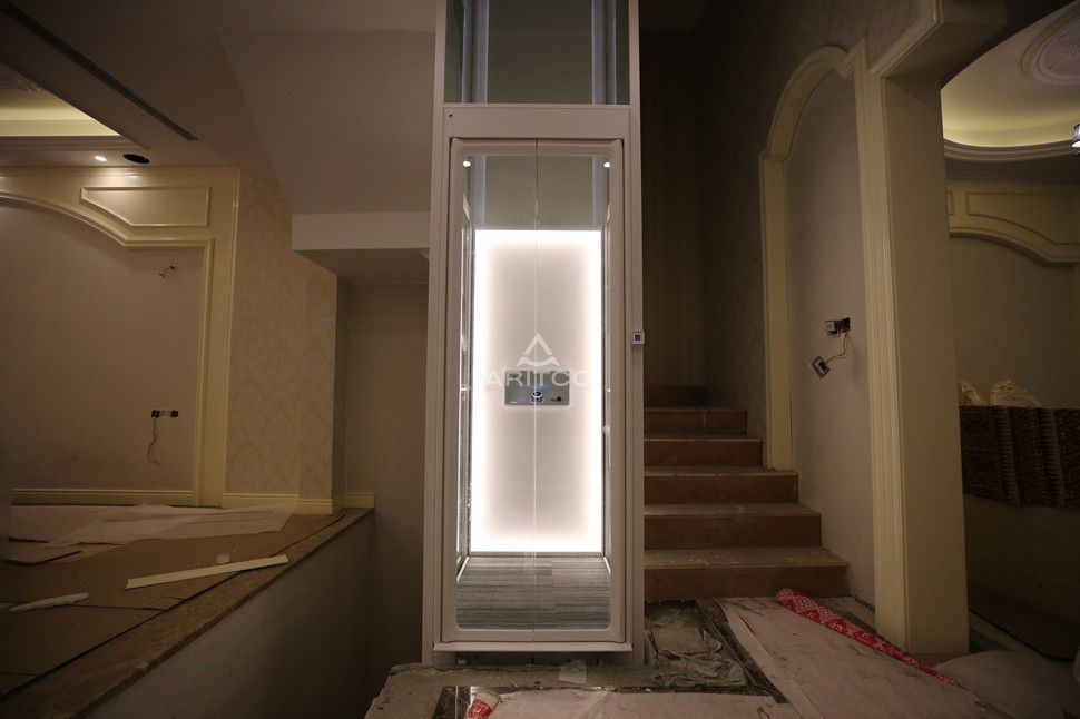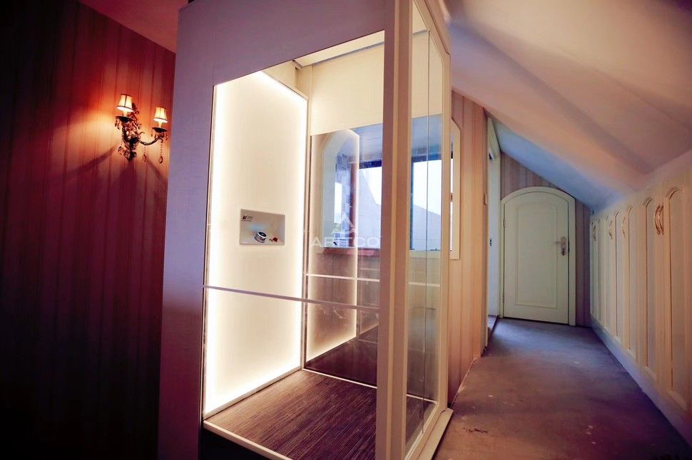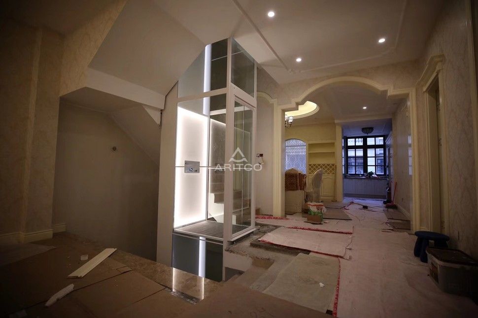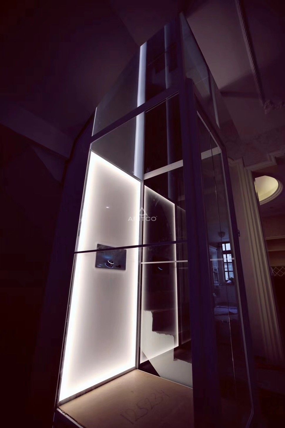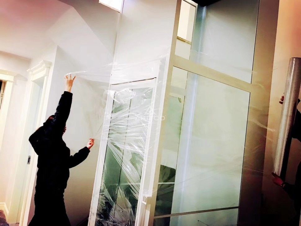 本案例位于江蘇南京,安裝在樓梯中間,因安裝完成后別墅的裝修依然沒有完成,安裝團隊為了保護電梯,在電梯的四周加了一次保護膜,防止灰塵進入電梯內(nèi)。