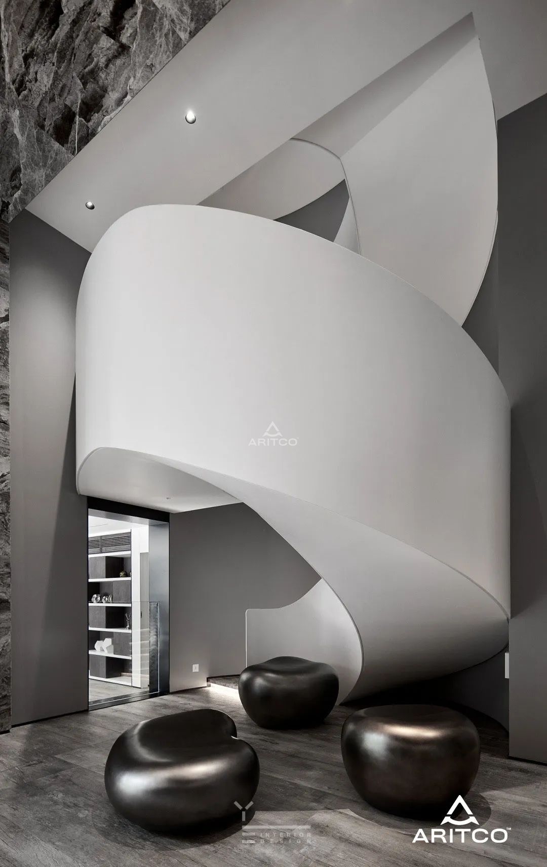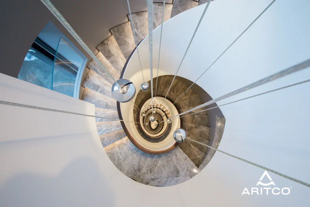 旋轉(zhuǎn)樓梯旁,瑞特科S系列家以電梯簡潔優(yōu)雅的外觀展現(xiàn)出大師級的工藝和細節(jié),從電梯間到建筑井道內(nèi),燈光點亮純白內(nèi)壁,更顯無瑕。