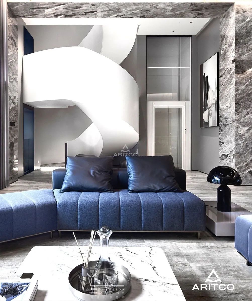 在客廳一角,旋轉(zhuǎn)樓梯與瑞特科S系列家用電梯并列擺放,通透潔白的產(chǎn)品設(shè)計與步梯外墻完美融合,直角與弧線,方圓之間的碰撞相得益彰。