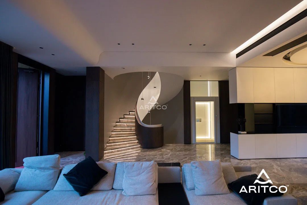 Aritco瑞特科家用電梯以優(yōu)雅精致的外觀與優(yōu)秀的燈光設(shè)計受到業(yè)主們的追捧,來自浙江臺州置信原墅的業(yè)主看中了這一點。業(yè)主與設(shè)計事務(wù)所將原有井道內(nèi)的曳引電梯拆除更換螺桿驅(qū)動,讓瑞特科S系列家用電梯的燈光與樓梯相呼應(yīng),打造出一間極具品位的別墅。
